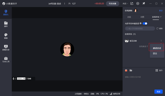 讲师可在 【讨论区】/ 【问答区】/ 【在线学员列表】(新增) 邀请对应学员进行连麦;