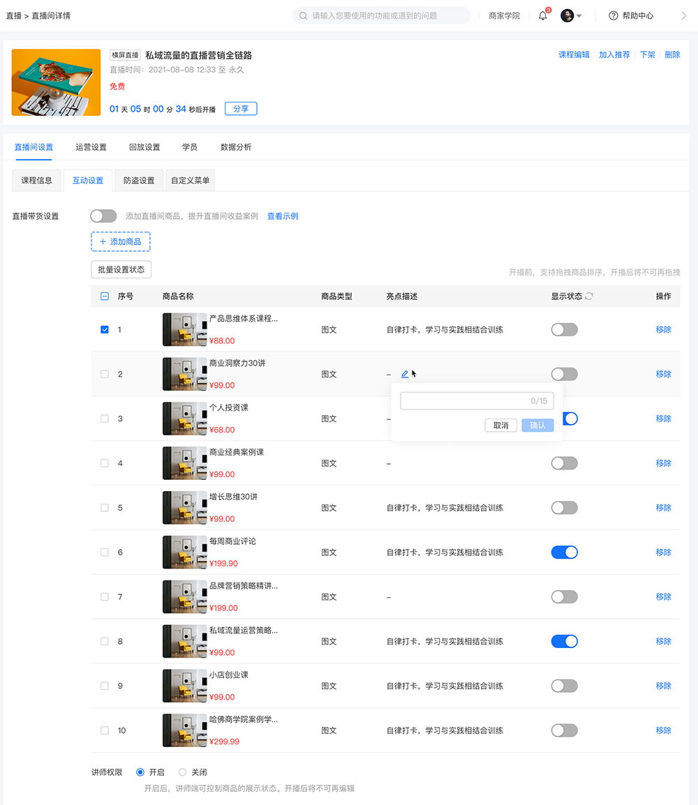 选择对应商品,支持对商品进行亮点描述、设置是否显示;同时直播前可通过拖拽调整商品顺序;
