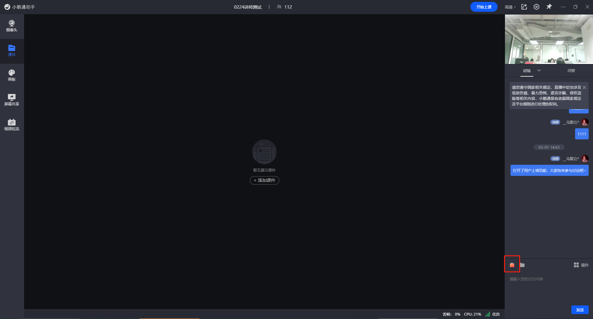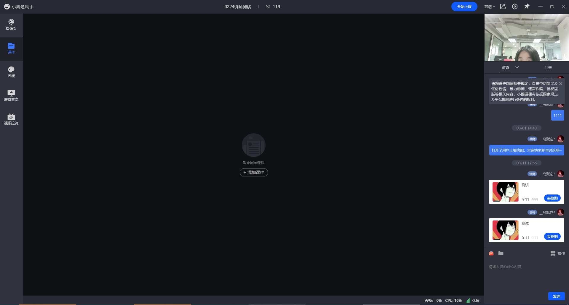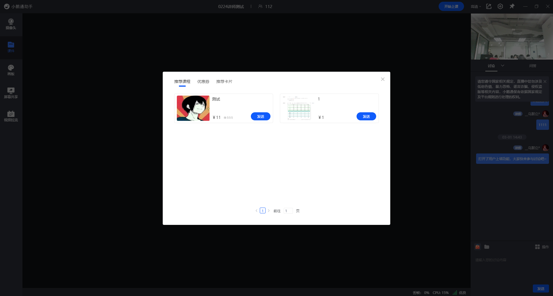 直播时,讲师可在直播间内点击购物车,在弹出的弹窗中将课程/优惠券/推荐卡片发送至视频区域。