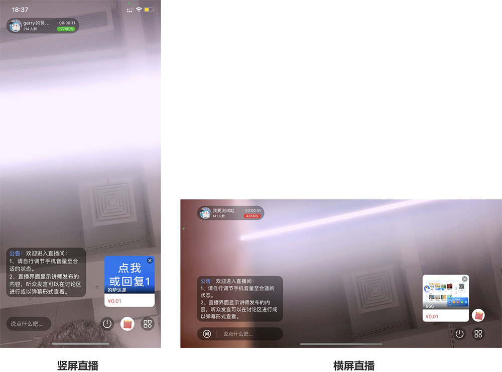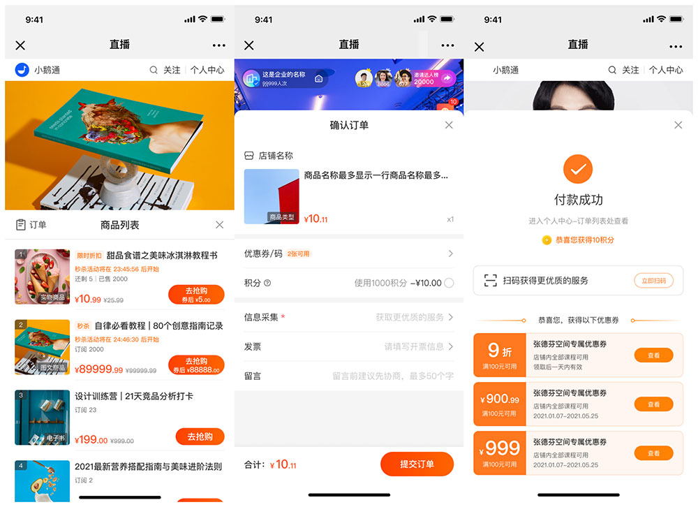 用户直播间直接下单购买知识商品和实物商品并支持相关营销工具,使得用户在直播中购买商品不用中断直播,拥有更好的购物体验,帮助商家更好进行直播带货。