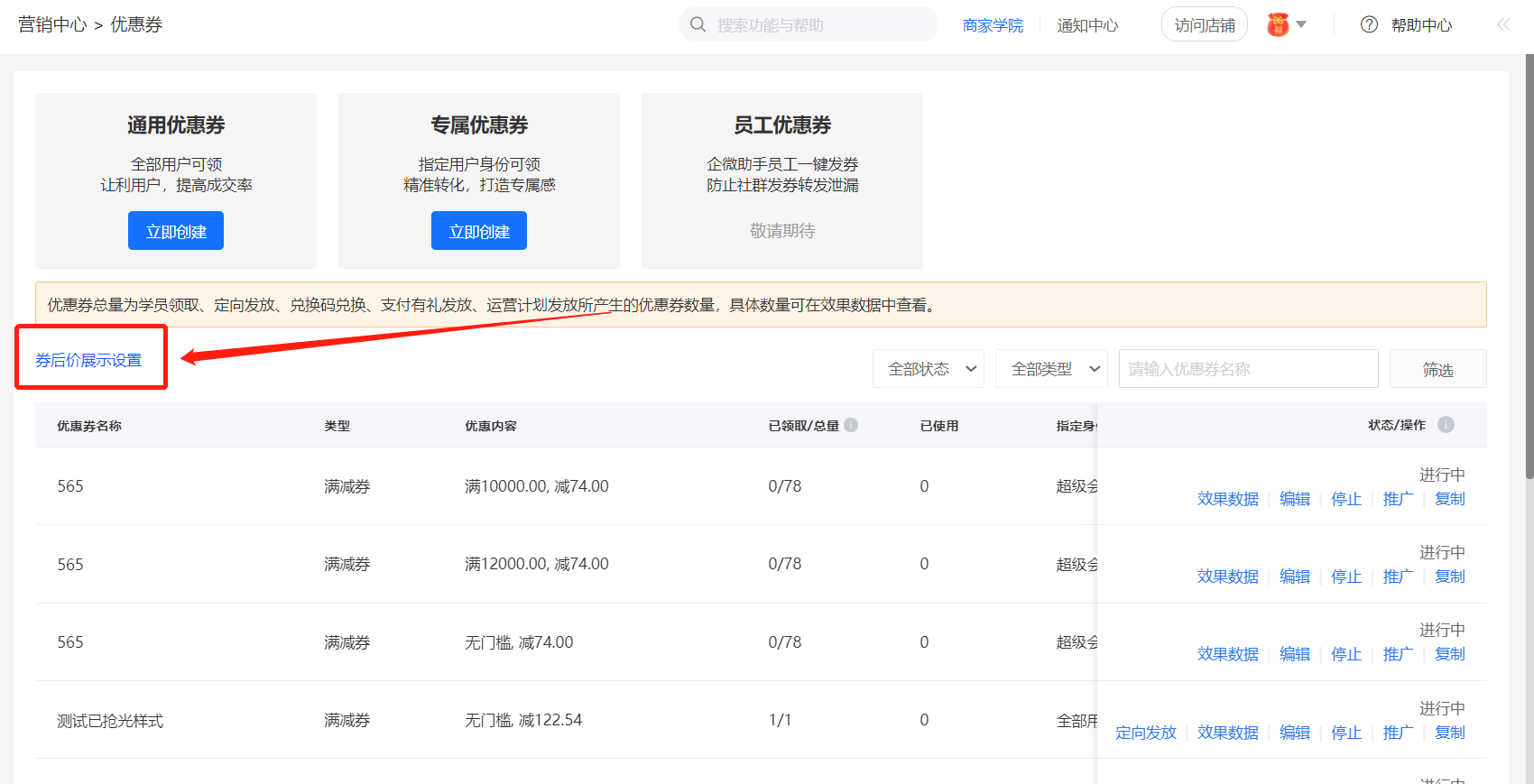 进入营销玩玩法-优惠券,点击【券后价展示设置】