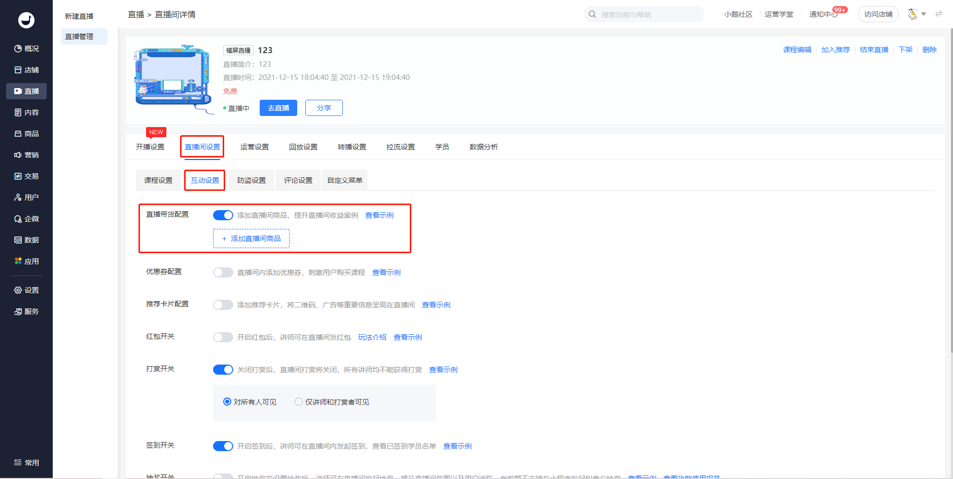 进入直播详情页,选择【直播间设置】-【互动设置】,开启直播带货。