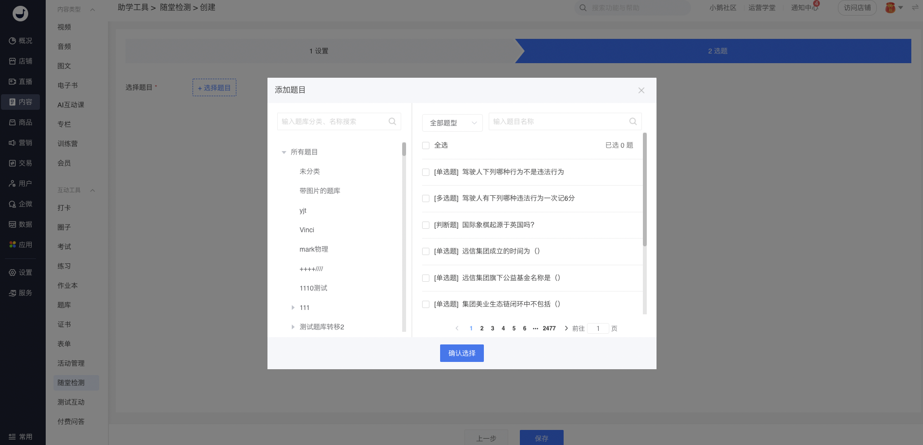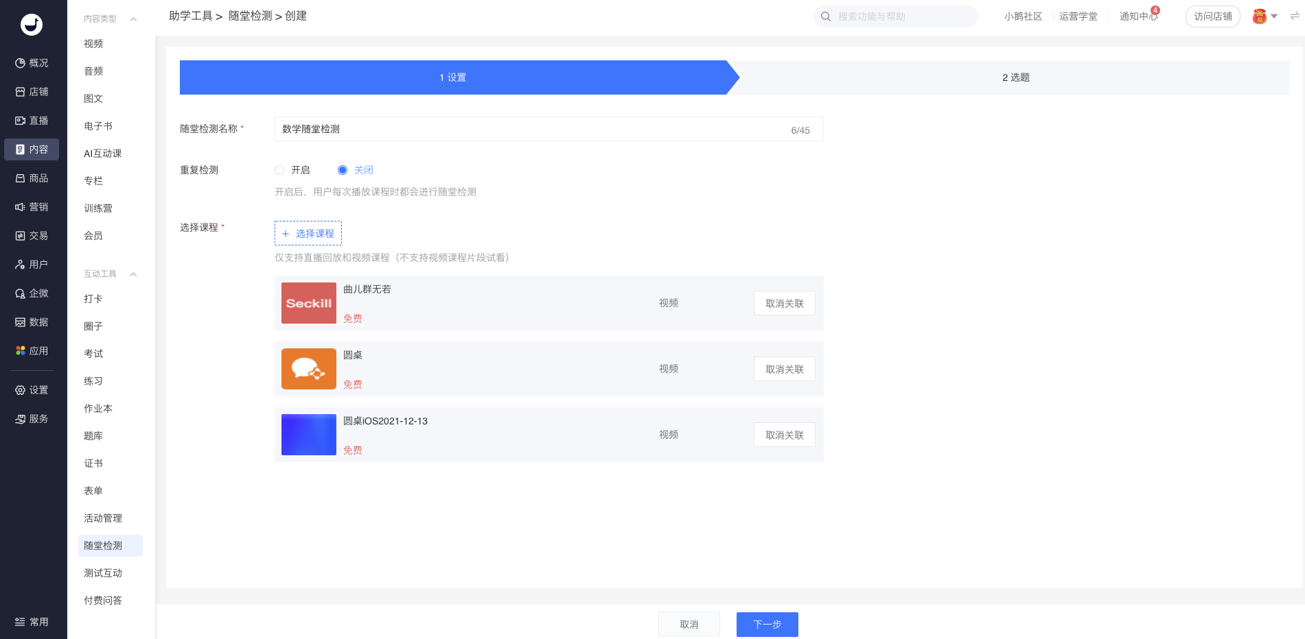 商家通过自由配置课程与题目,自由设置题目弹出时间,实现学员在课程学习过程中弹出相应的题目,从而达到随堂检测的能力以及督促学习的能力,保障了学员的学习质量。