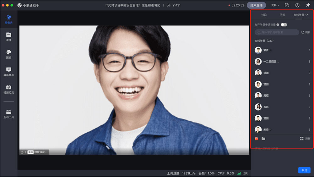 1、实时查看直播间的真实在线人数,并对在线学员进行管理;
