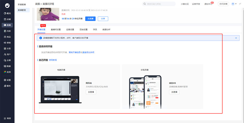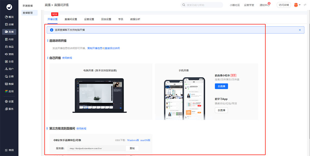小鹅通支持 3 大类直播类型:分别是视频直播、语音直播、录播直播,其中视频直播分为【横屏直播】与【竖屏直播】两种直播模式。