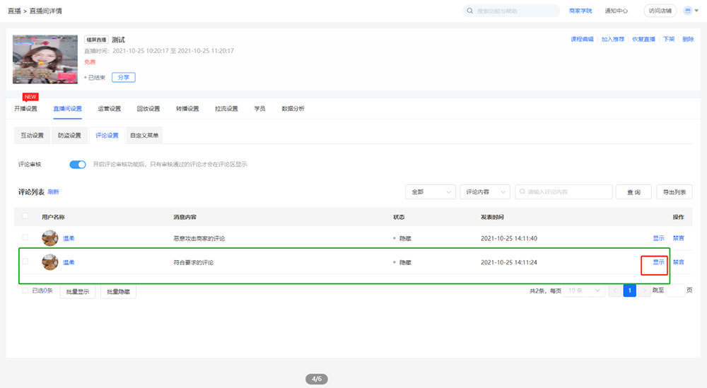 审核用户在直播间发送的评论,对审核通过的符合商家要求的评论进行【显示】操作,状态列为当前评论的显示状态,状态为“显示”的评论对直播间内所有人可见,状态为“隐藏”的评论对直播间内所有人不可见(除发送此条评论的用户本人外)。