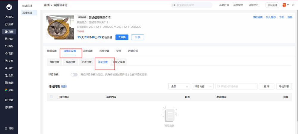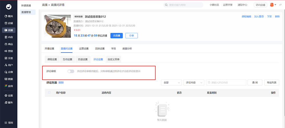 商家端:电脑端管理台 → 直播 → 详情 → 详情 → 直播间设置→ 评论设置