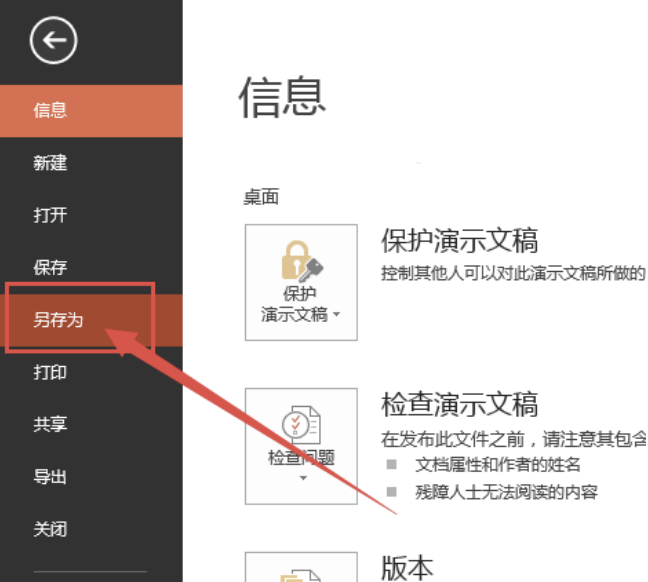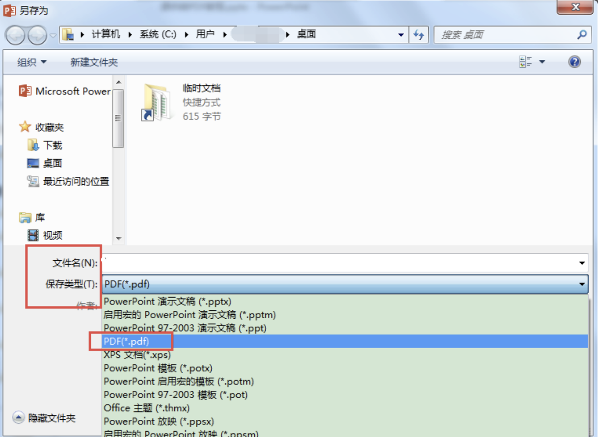 2、接着点击“另存为—选择保存路径—设置课件名字— 设置保存类型为PDF” 保存即可