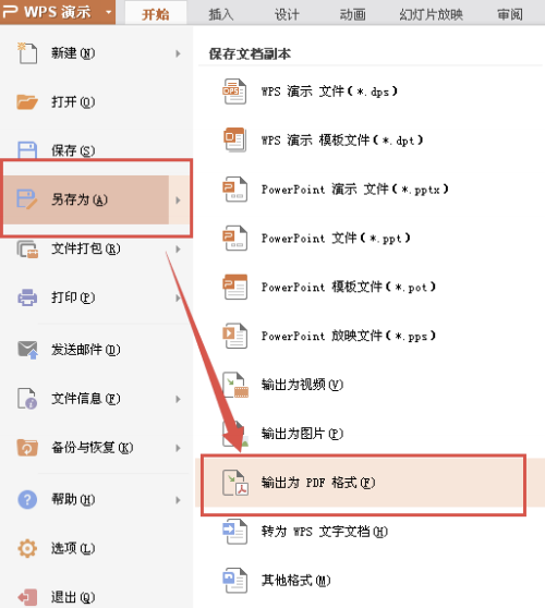 2、在“WPS演示菜单”中点击: “另存为-输出为PDF 格式”即可