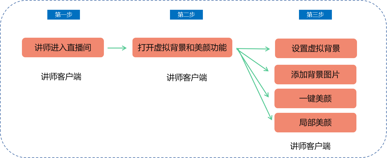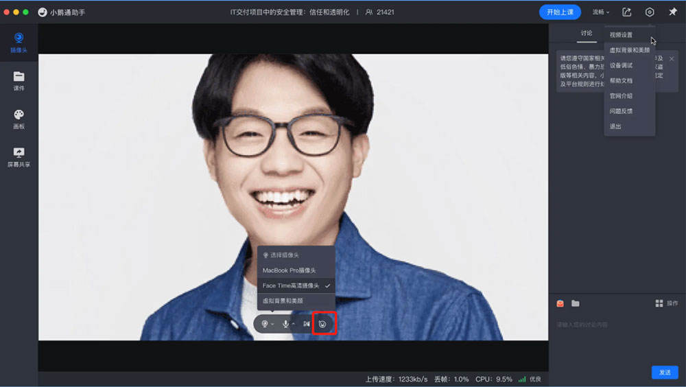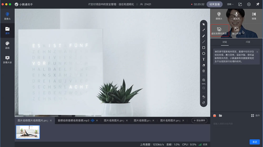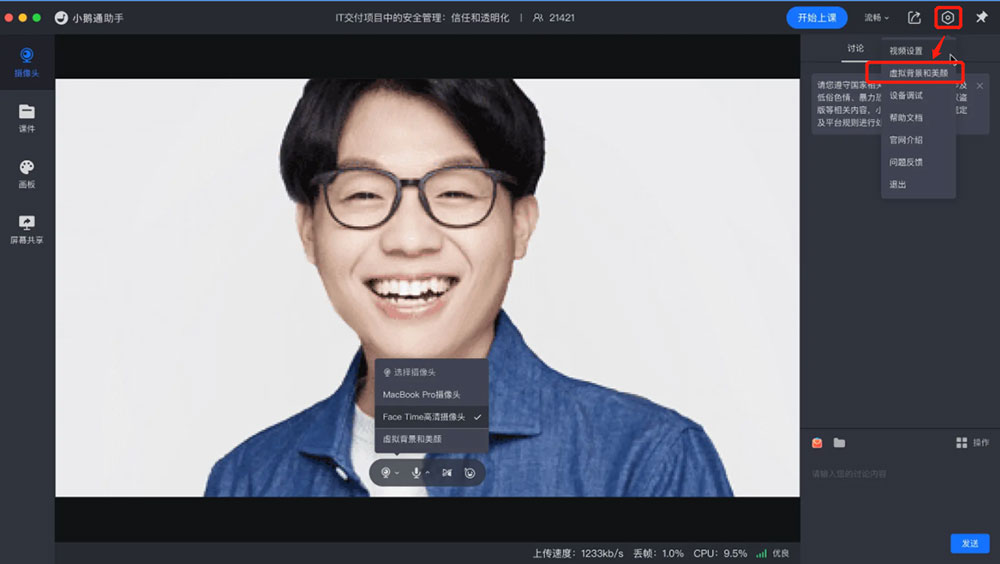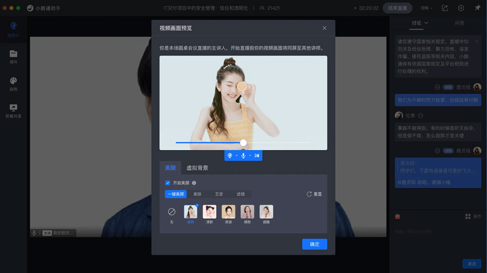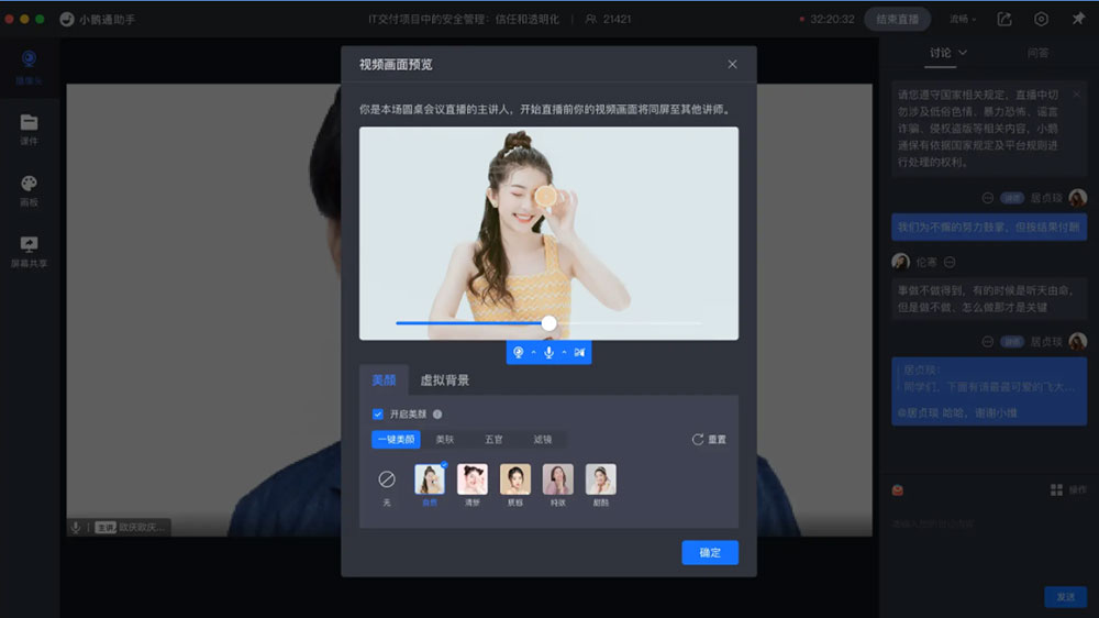 讲师端:进入直播间-打开虚拟背景和美颜-设置参数和效果-实时生效