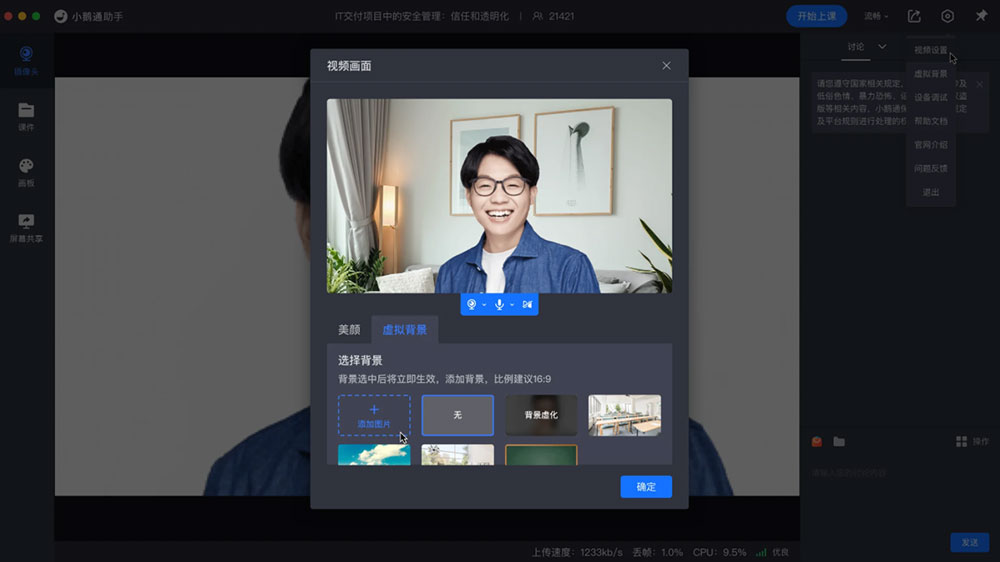 虚拟背景:支持修改摄像头背景内容,支持上传图片背景和背景虚化;