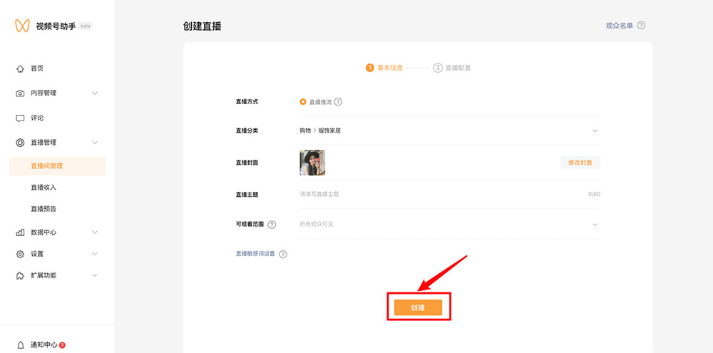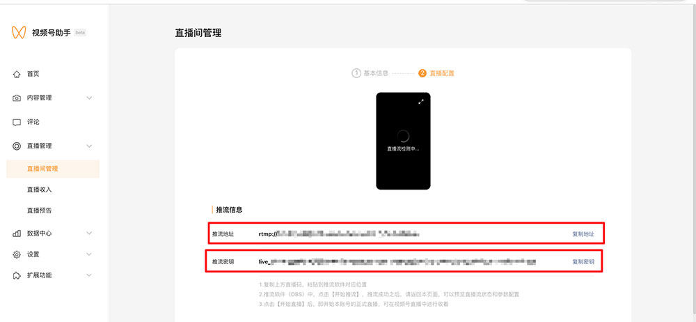 需要商家重新创建视频号直播间,获取推流地址,具体操作如下: