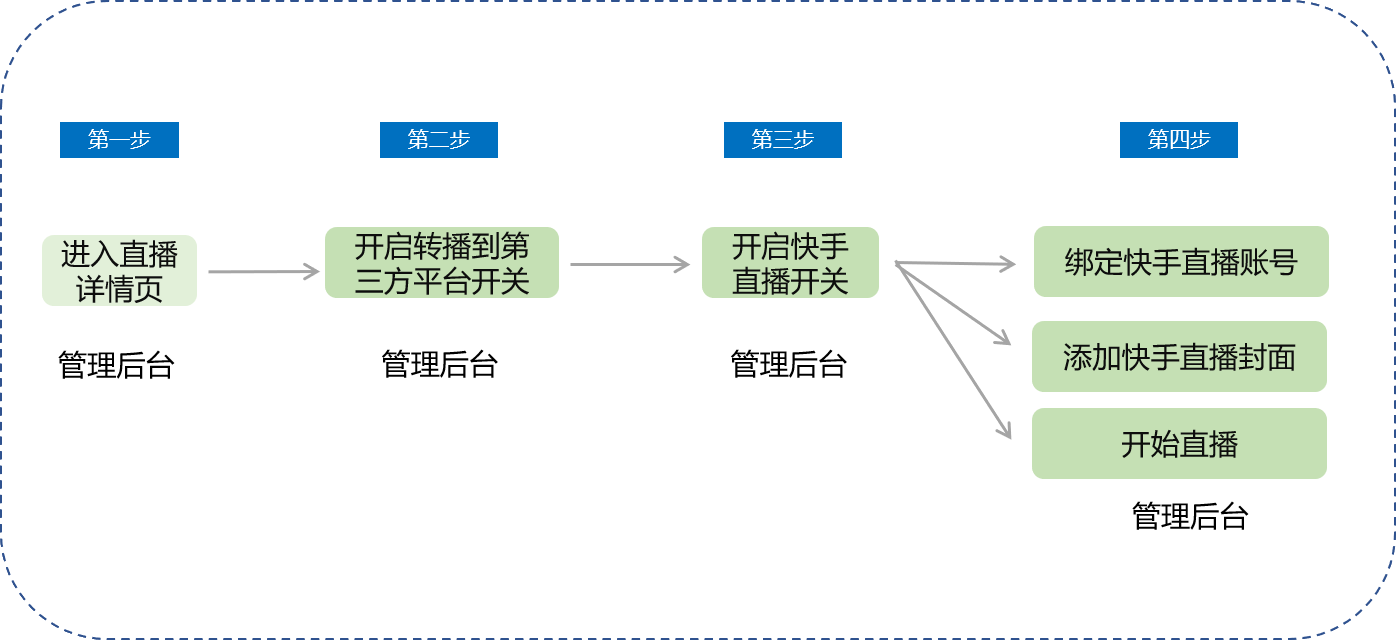 商家端:直播 → 直播详情 → 分发设置 → 转播到第三方平台 → 快手直播
