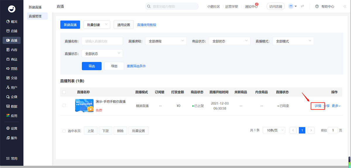 第一步 进入直播详情页(管理后台):进入“直播-详情”页
