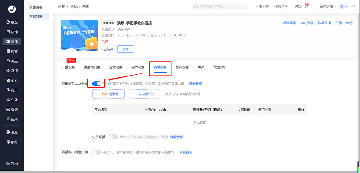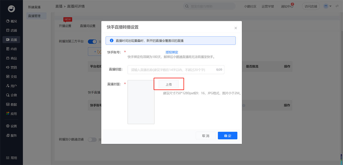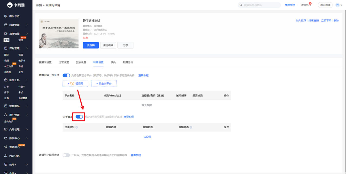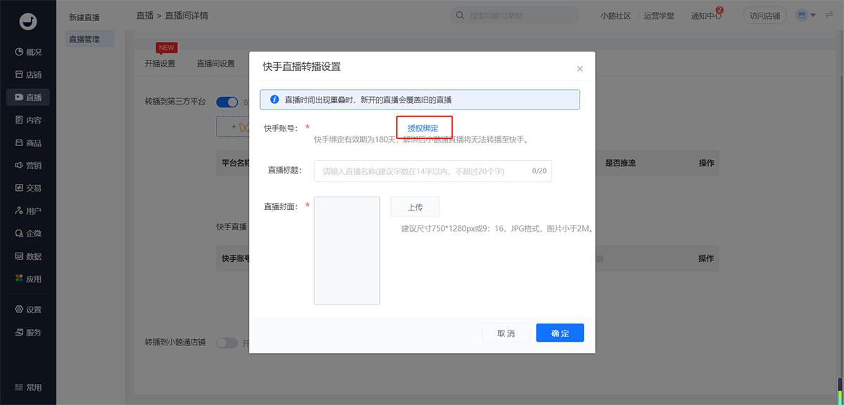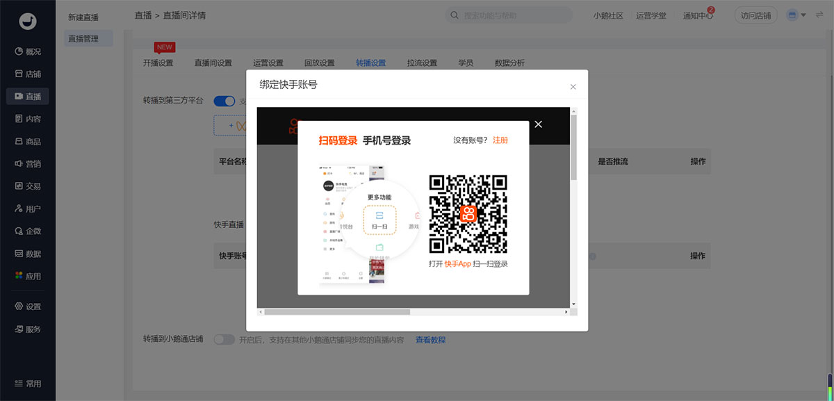 商家想扩大影响力,绑定快手直播账号,在小鹅通直播的同时,可以转播到快手直播,将直播同步在快手直播平台,增大直播曝光度,获取更大收益