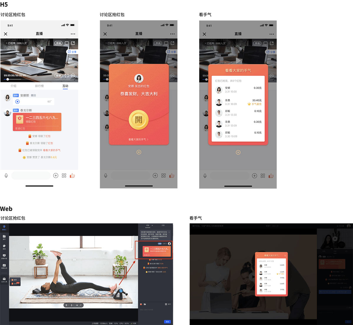 支持讲师在直播间(视频、语音直播)发手气红包或等分红包,提高讲师与观众的互动能力,增强直播间氛围感。