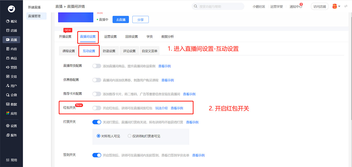 创建直播后,进入【直播间详情】页面,找到【直播间设置】-【互动设置】,开启直播间红包开关。