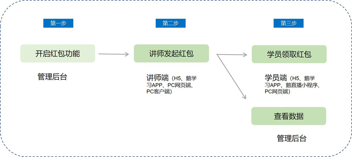 目前支持发红包的讲师端有:H5、鹅学习App、鹅直播小程序(仅安卓)、网页端、PC客户端-小鹅通助手。具体操作如下: