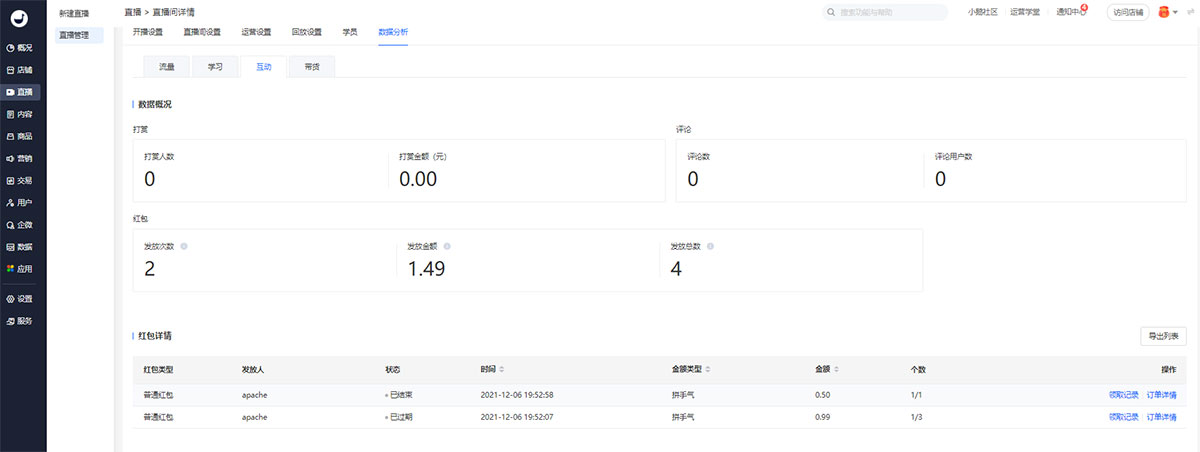 相关数据可在【数据分析】-【互动】中查看红包发放及领取情况