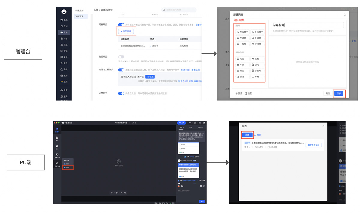 ● 管理台:在直播间详情页-直播间设置-互动设置-问卷开关-添加问卷-填写内容并保存