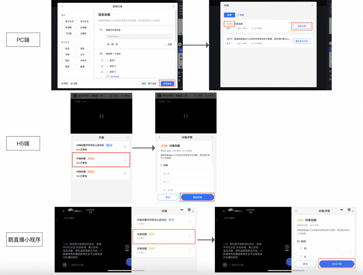 ○ H5端:直播间-点击+号-选择问卷-在列表中选择未开始的问卷点击发起问卷