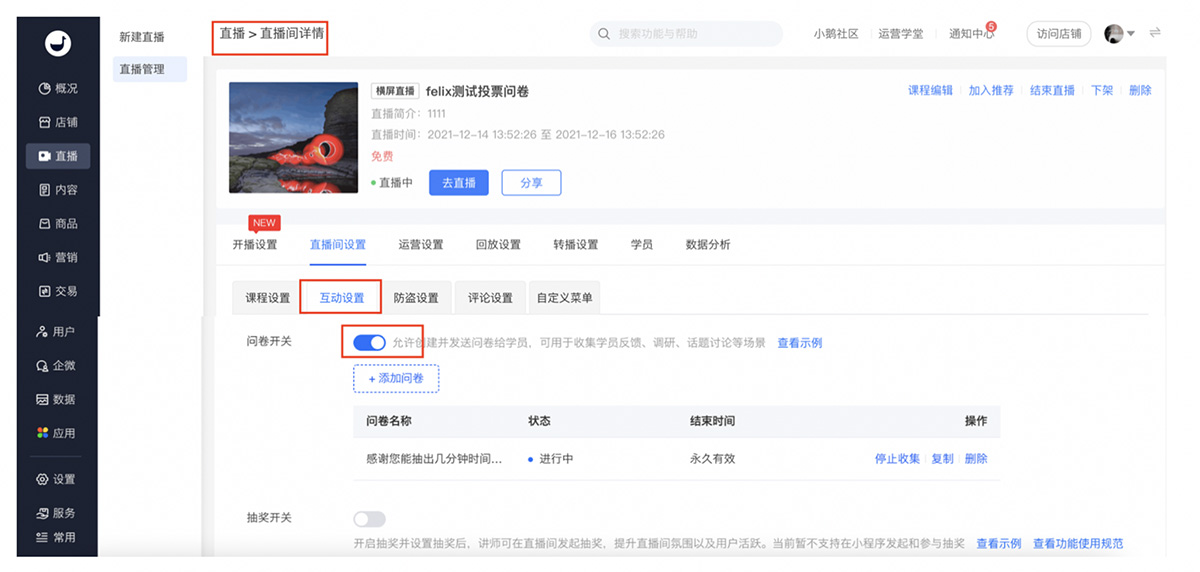 ● 在直播间详情页-直播间设置-互动设置-问卷开关可看见开启问卷入口;