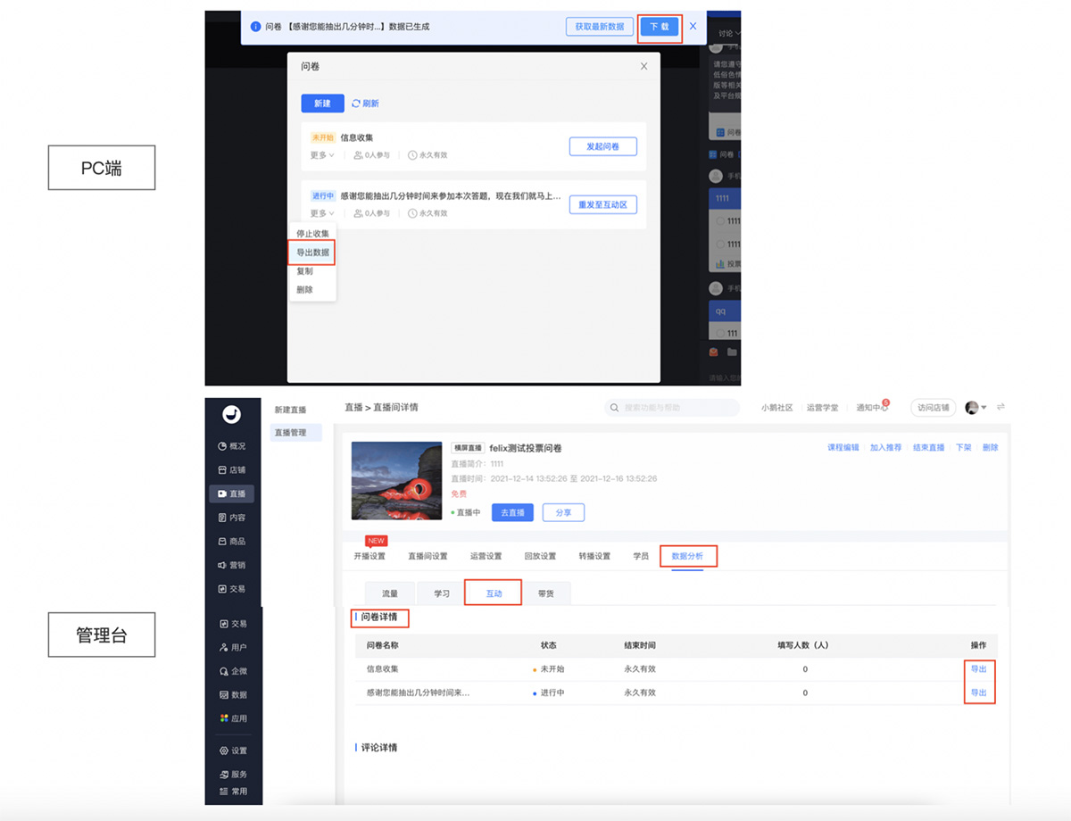 ○ 管理台:直播间详情-数据分析-互动-问卷详情