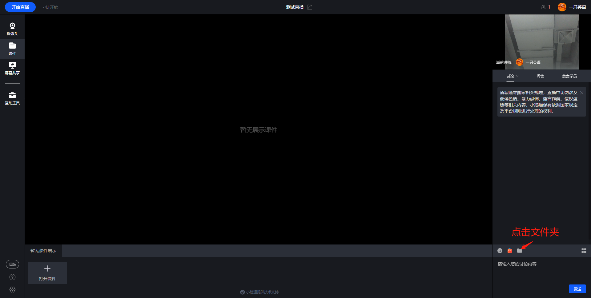 讲师进入直播间,点击【文件夹】按钮,出现弹窗