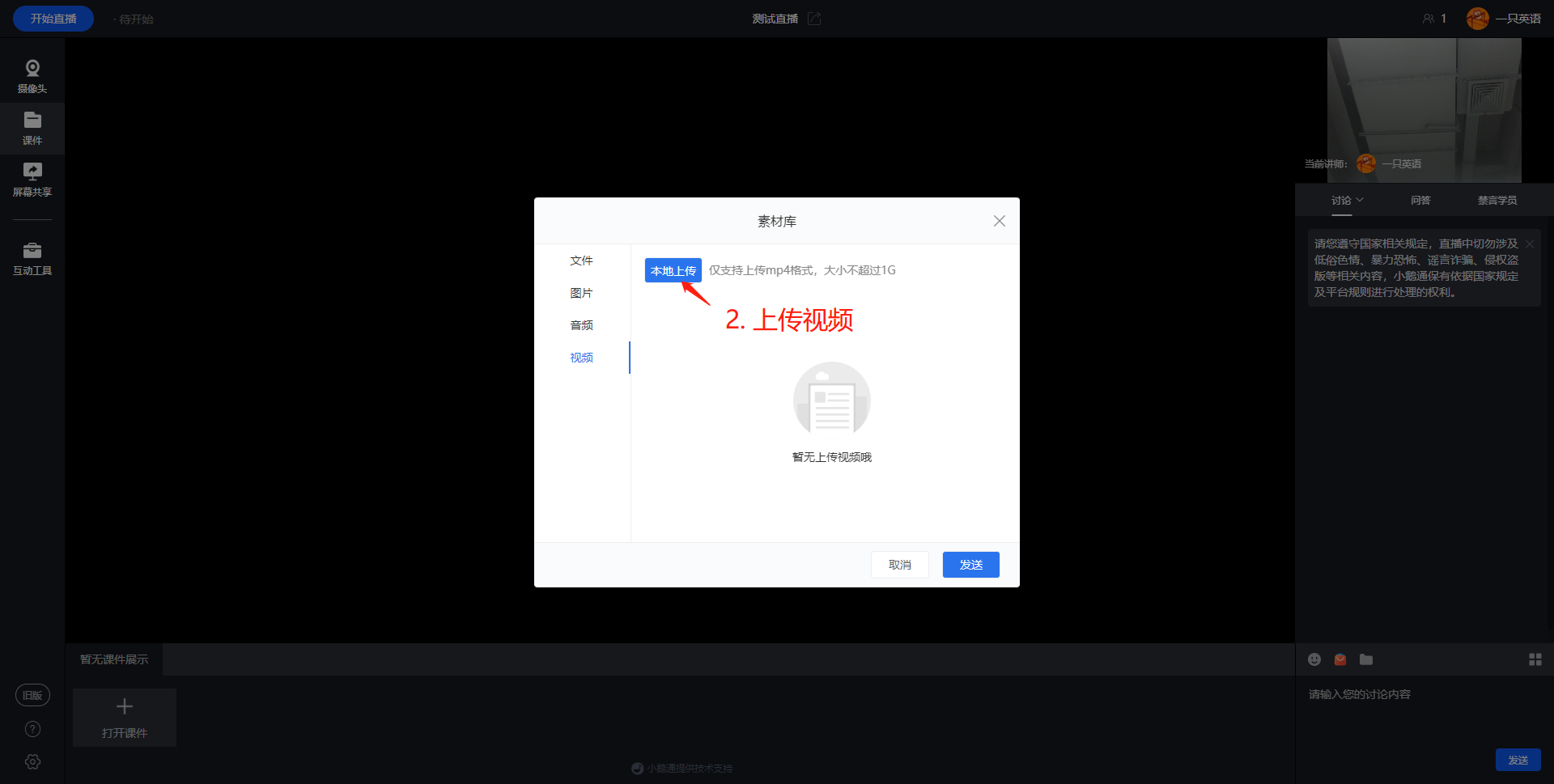 弹窗内切换到视频类型,点击【本地上传】,上传视频