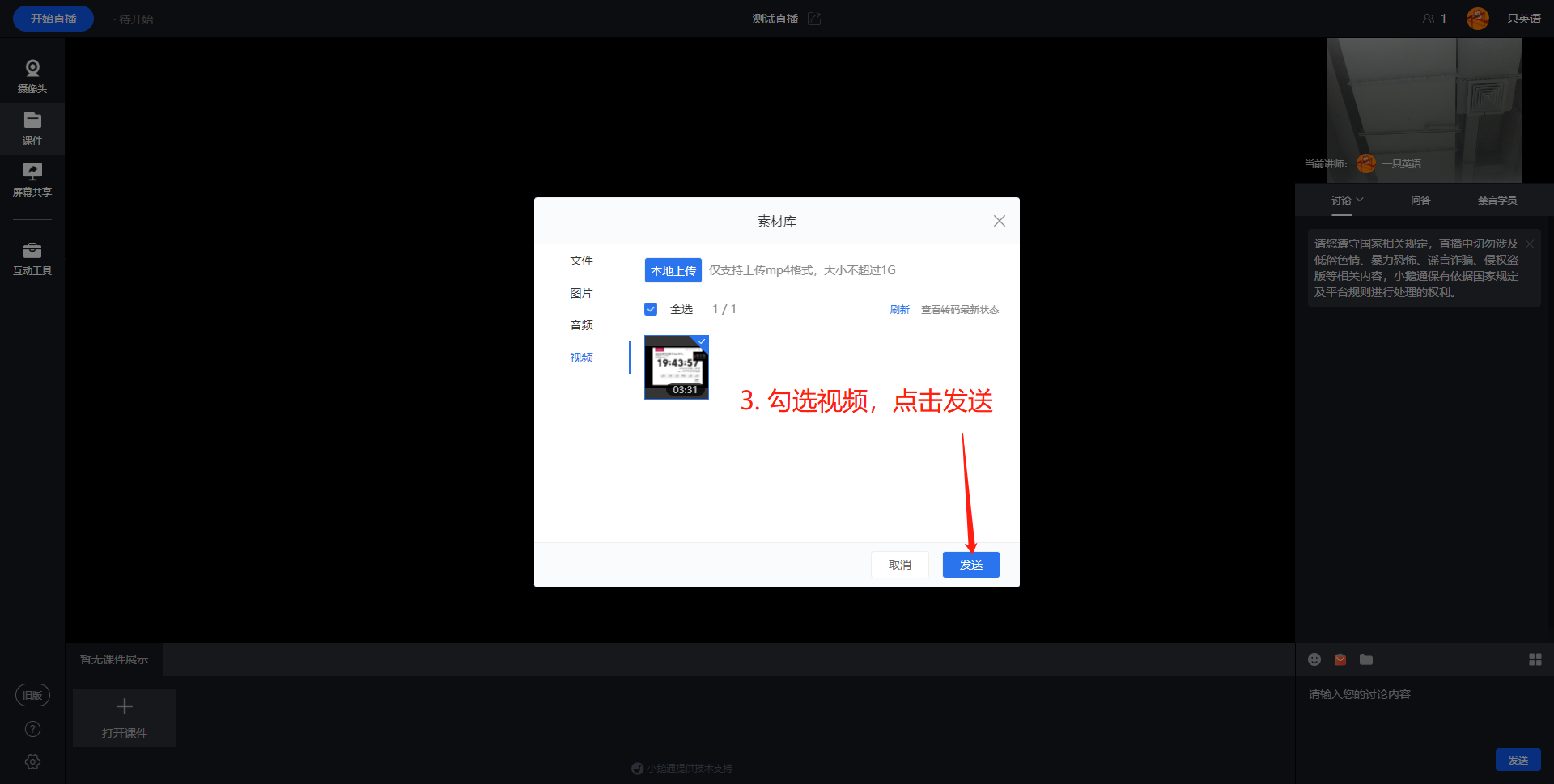 等待视频转码,转码成功后即可勾选视频,点击【发送】按钮,即可发送视频