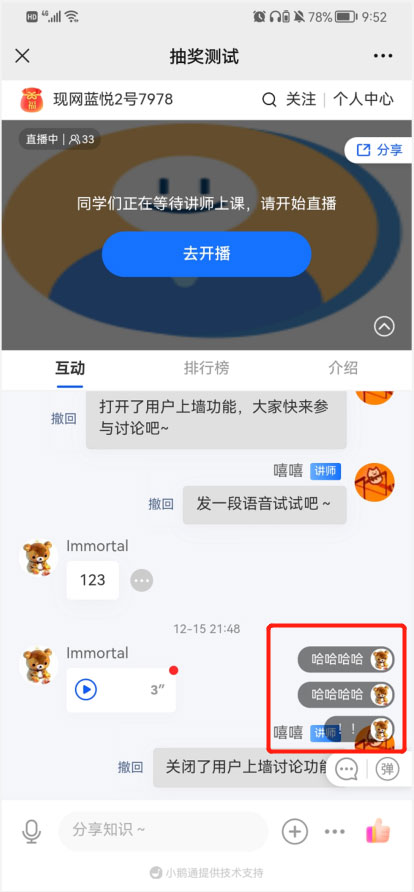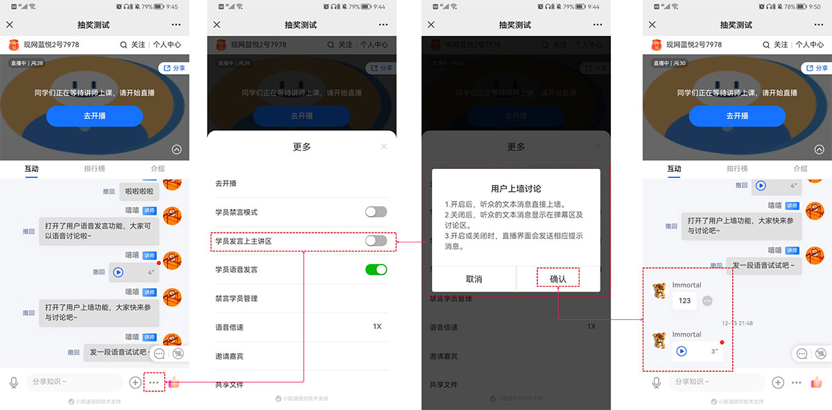 开启用户(即听众)发言上墙功能,用户发言将和讲师一样可显示在直播主界面。