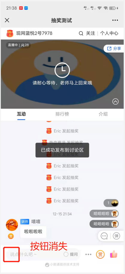 关闭用户上墙讨论后,系统自动帮助讲师发送一条信息提示,提醒听众该功能已关闭,听众发送的信息将呈现在弹幕区。