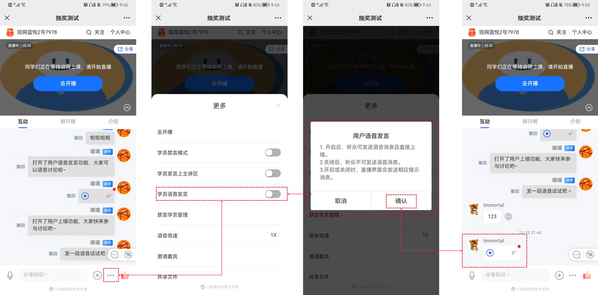 开启学员语音发言功能,听众可以发送语音,语音将呈现在直播主界面。操作路径:讲师点击底部工具栏【操作】→开启【用户语音发言功能】。