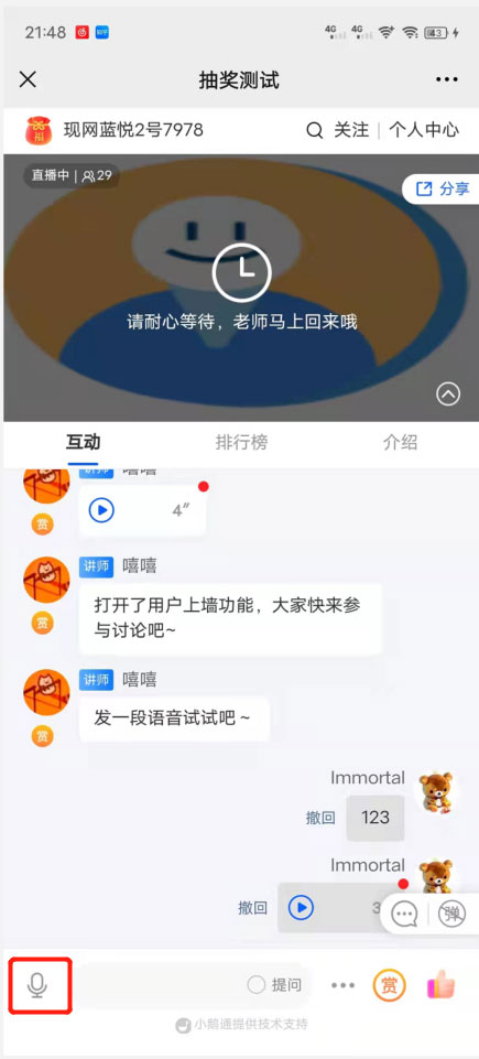 开启后,系统自动帮助讲师发送一条信息提示,提醒听众该功能已开启。听众端“麦克风”出现,可以使用语音发言功能。