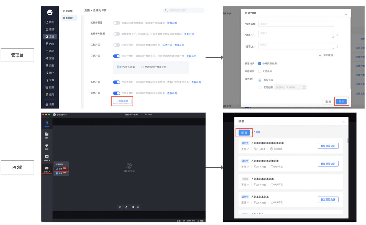 ● 管理台:在直播间详情页-直播间设置-互动设置-投票开关-添加投票-填写内容并保存