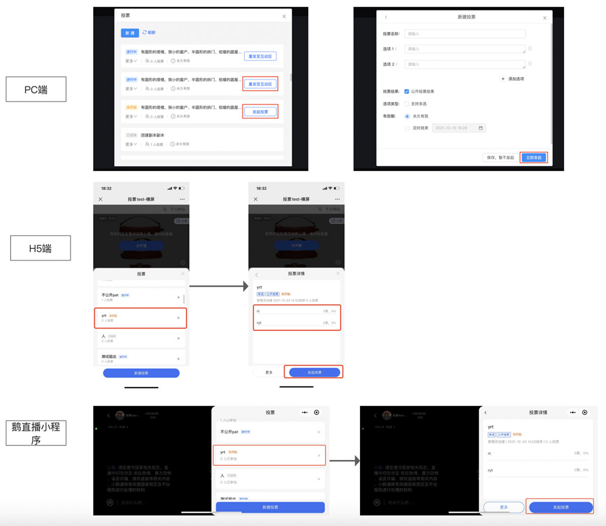 ○ H5端:直播间-点击+号-选择投票-选择未开始的投票点击发起投票
