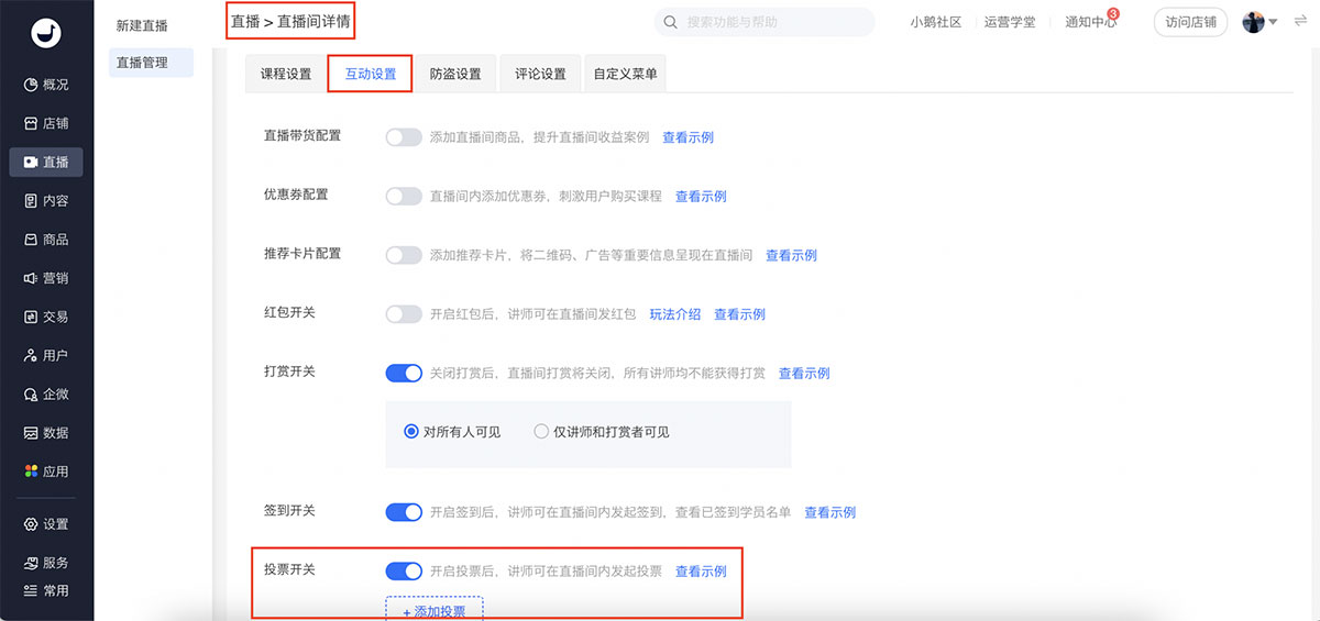 ● 在直播间详情页-直播间设置-互动设置-投票开关可看见开启投票入口;