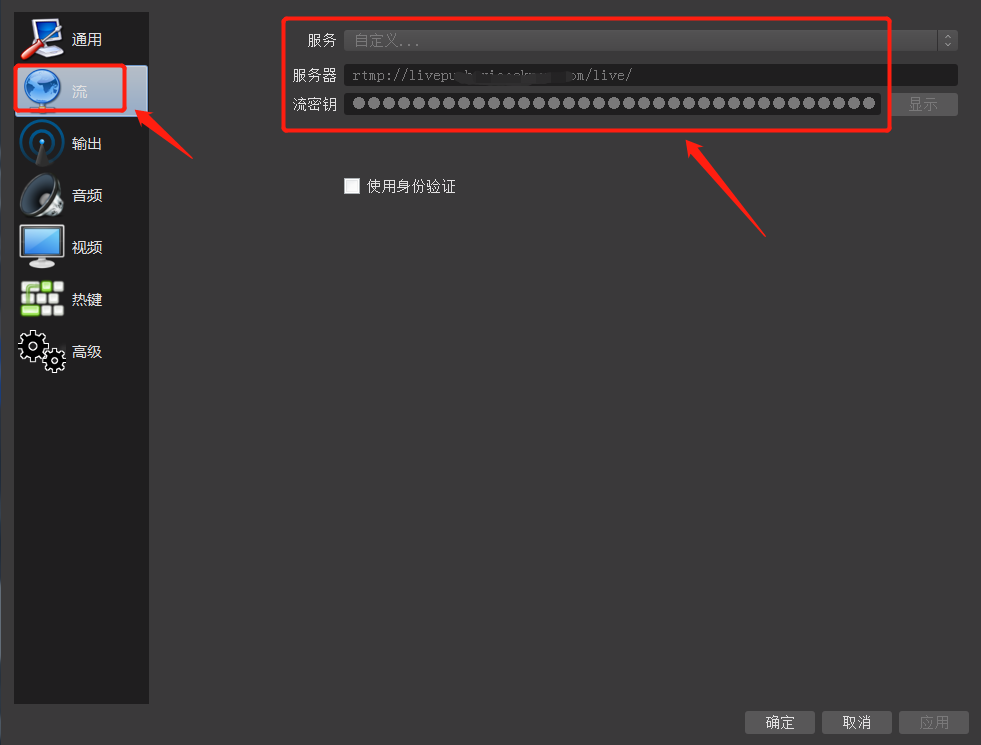 1、 确认推流的串流密钥和服务器地址都已填写正确(即填写在OBS中的目标直播间的URL和流名称),在讲师未填写的情况下,对应直播间的串流密钥导致直播画面推流到其他直播间去了;如已有填写的对应的串流密钥和服务器地址,请核实是否填写正确【确实路径:OBS--设置--流】