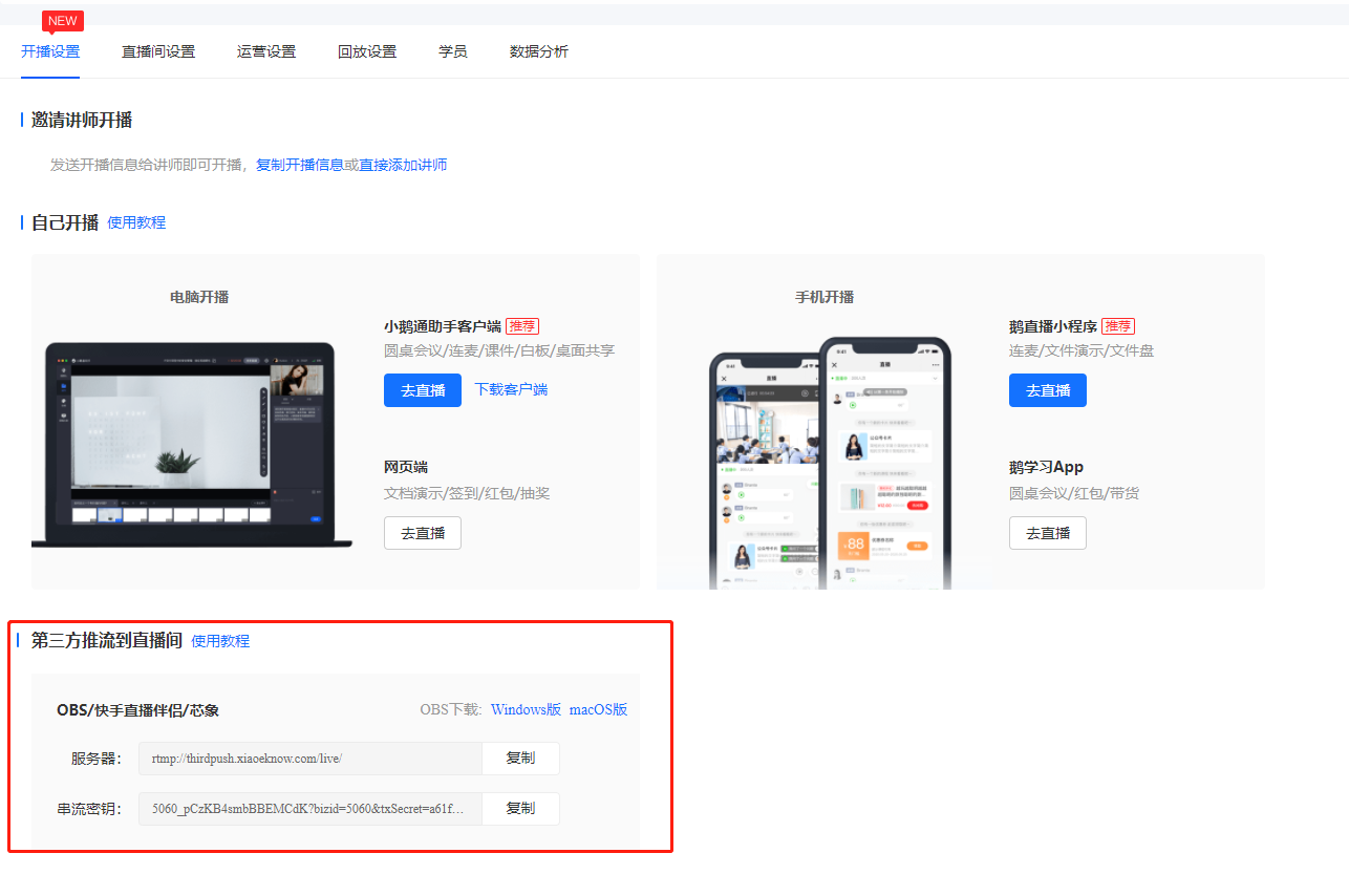 1、可进入到小鹅通商家后台点击【直播】,找到相应的课程后点击【更多>去直播>开播设置】复制“服务器”和“串流密钥"