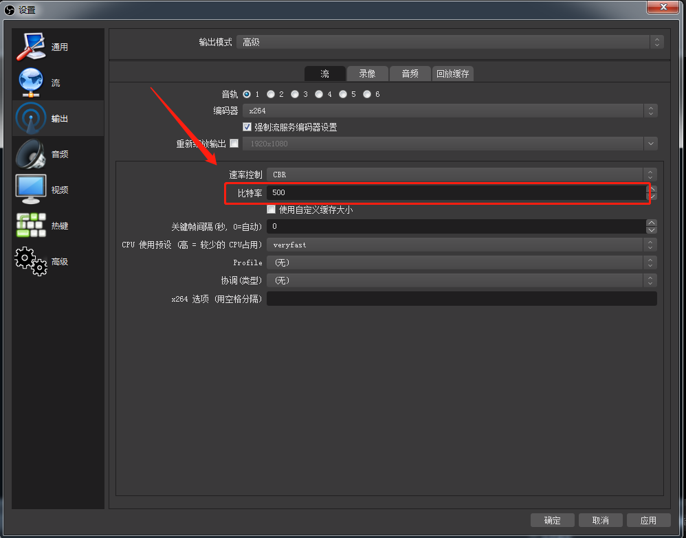在OBS主界面,在操作栏中点击【设置】,打开设置页面,在左侧功能栏处选择【输出】,更改视频比特率即可。