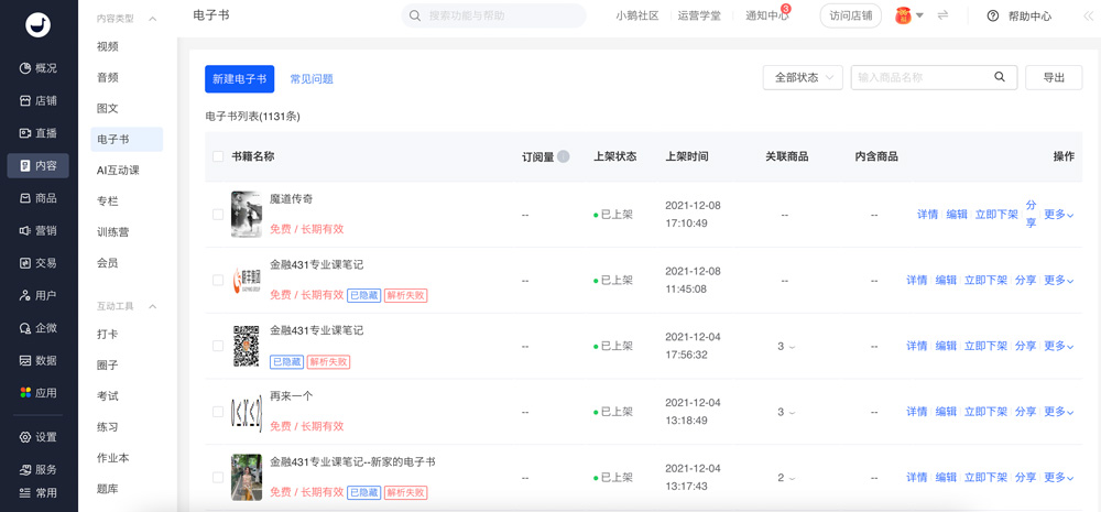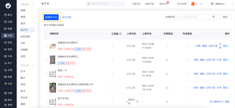 1、登录小鹅通管理台,从【内容】选择【电子书】→【新建电子书】;