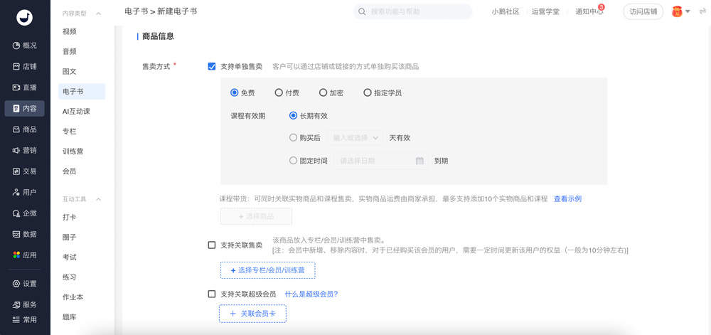 2)关联售卖——选择关联售卖,点击选择按钮,弹窗显示专栏、会员、训练营列表,选择关联的内容,确定保存后,在专栏、会员详情内将会展示该商品信息。