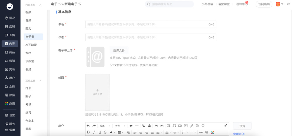 商家端:商家后台 →内容 → 电子书 → 新建电子书