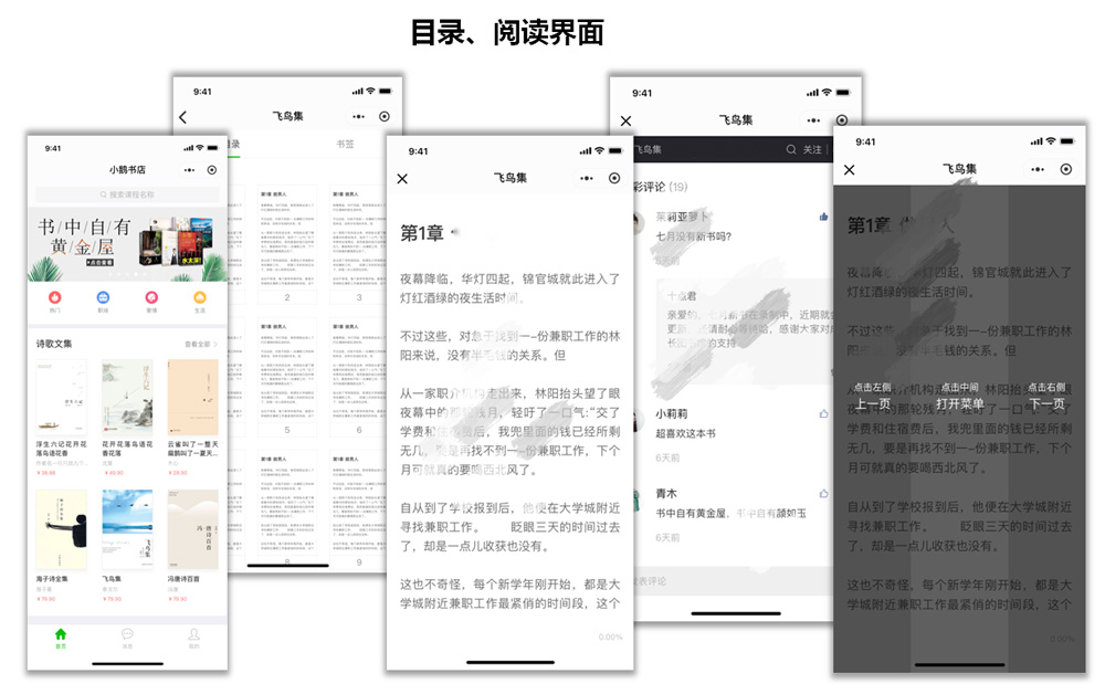 电子书,是实现电子书籍在线付费的知识商品形态。支持一键导入本地资源,系统自动解析书籍章节,轻松完成电子书在线管理和售卖,用户可在手机端阅读,支持区域触摸翻页、章节试读、划线、书签、更换背景等功能,大大提升阅读体验。
