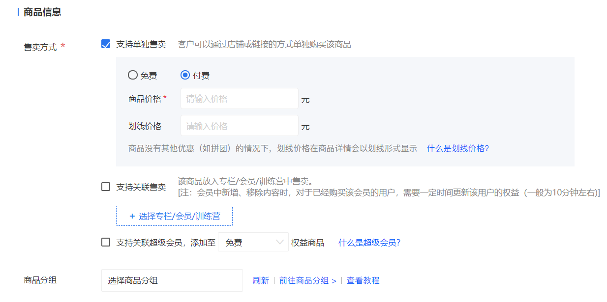 2)关联售卖——选择关联售卖,点击选择按钮,弹窗显示专栏、会员、训练营列表,选择关联的内容,确定保存后,在专栏、会员详情内将会展示该商品信息。