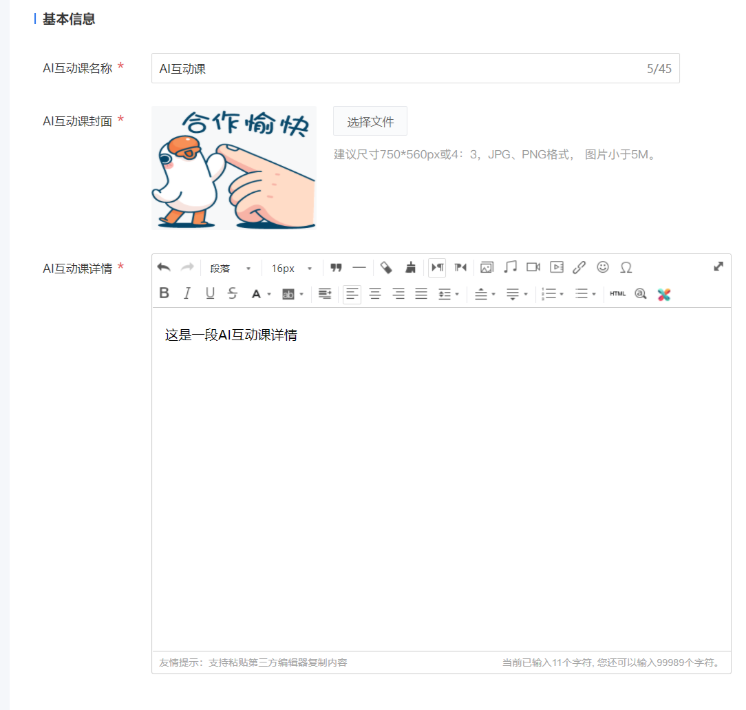 2.基本信息:填写AI互动课名称、详情内容信息、课程封面、课程内容组件设置与售卖信息。 点击【保存】即可成功创建AI互动课商品。
