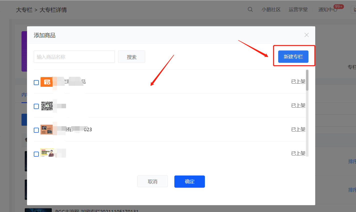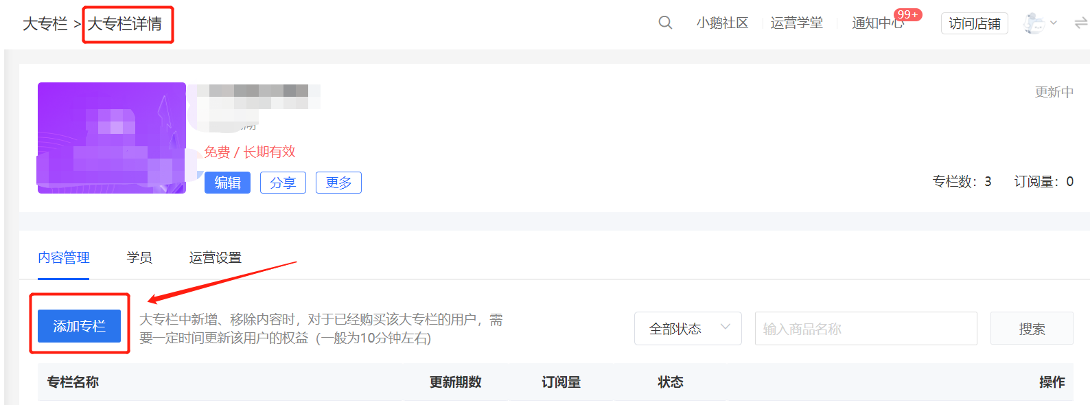 在大专栏列表中选择要添加内容的专栏,点击【详情】,进入大专栏详情页,点击【添加专栏】;