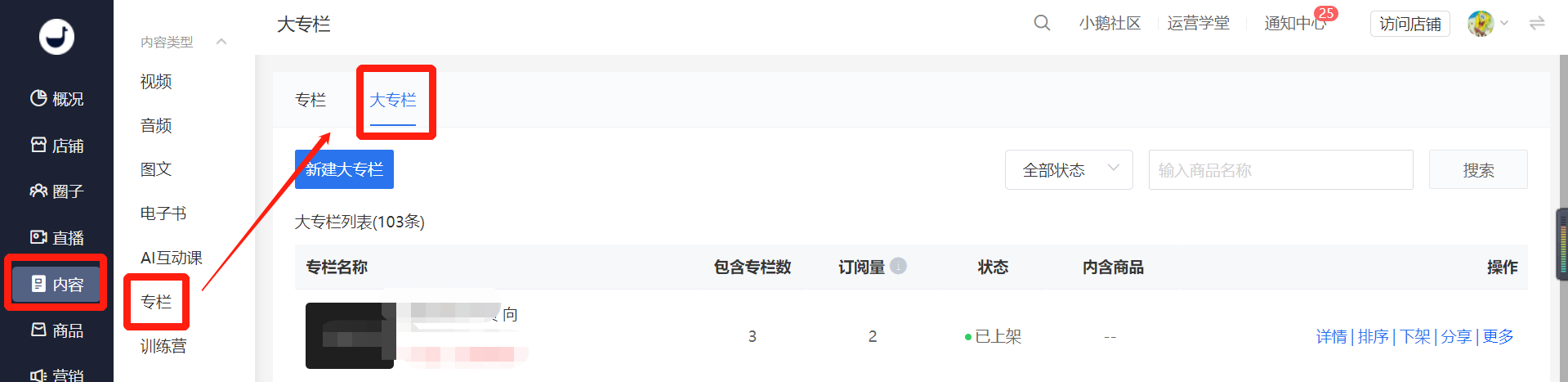 1、登录小鹅通店铺管理后台,点击【内容-内容类型】-【专栏】,选择【大专栏】;点击【新建大专栏】