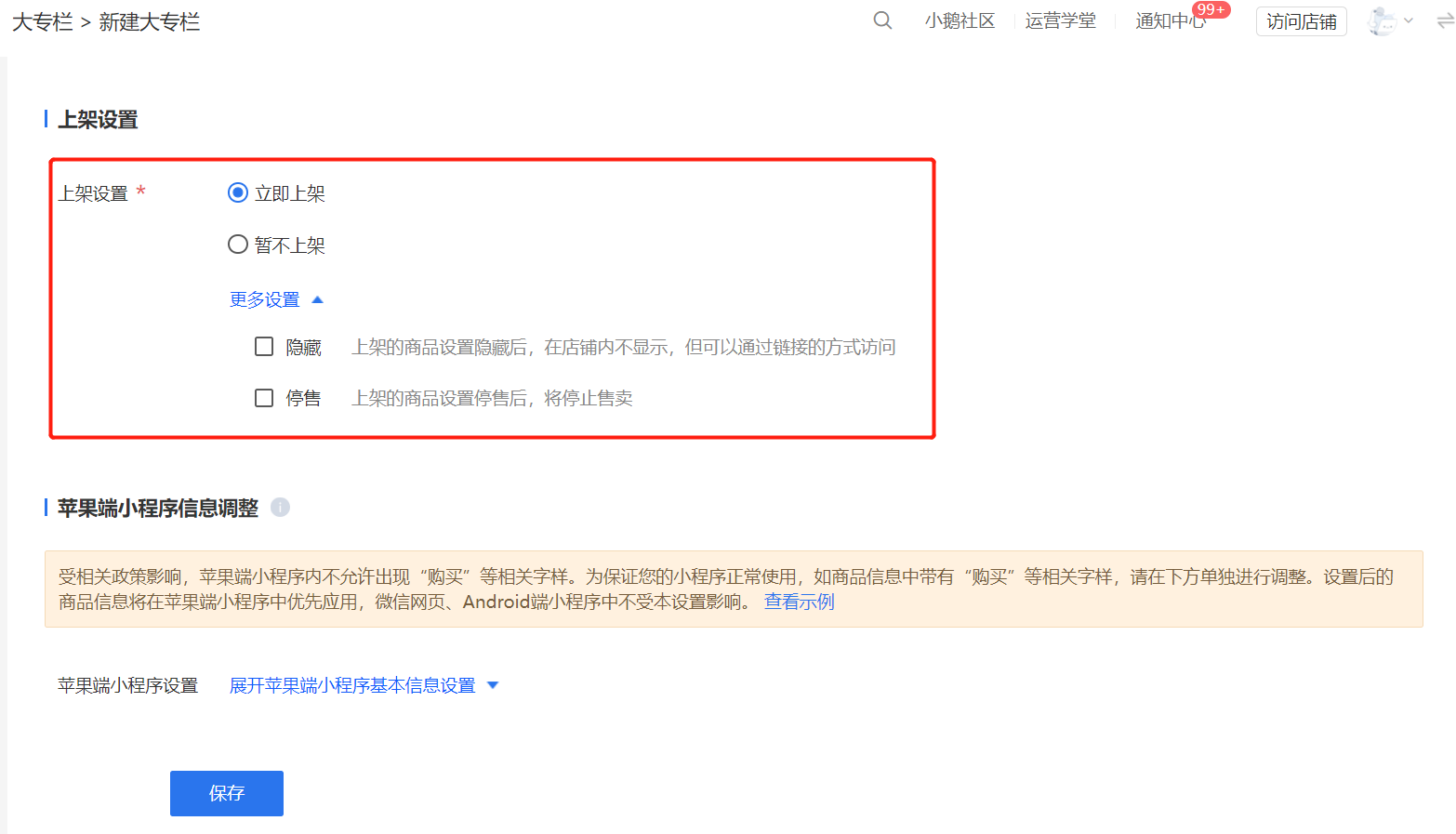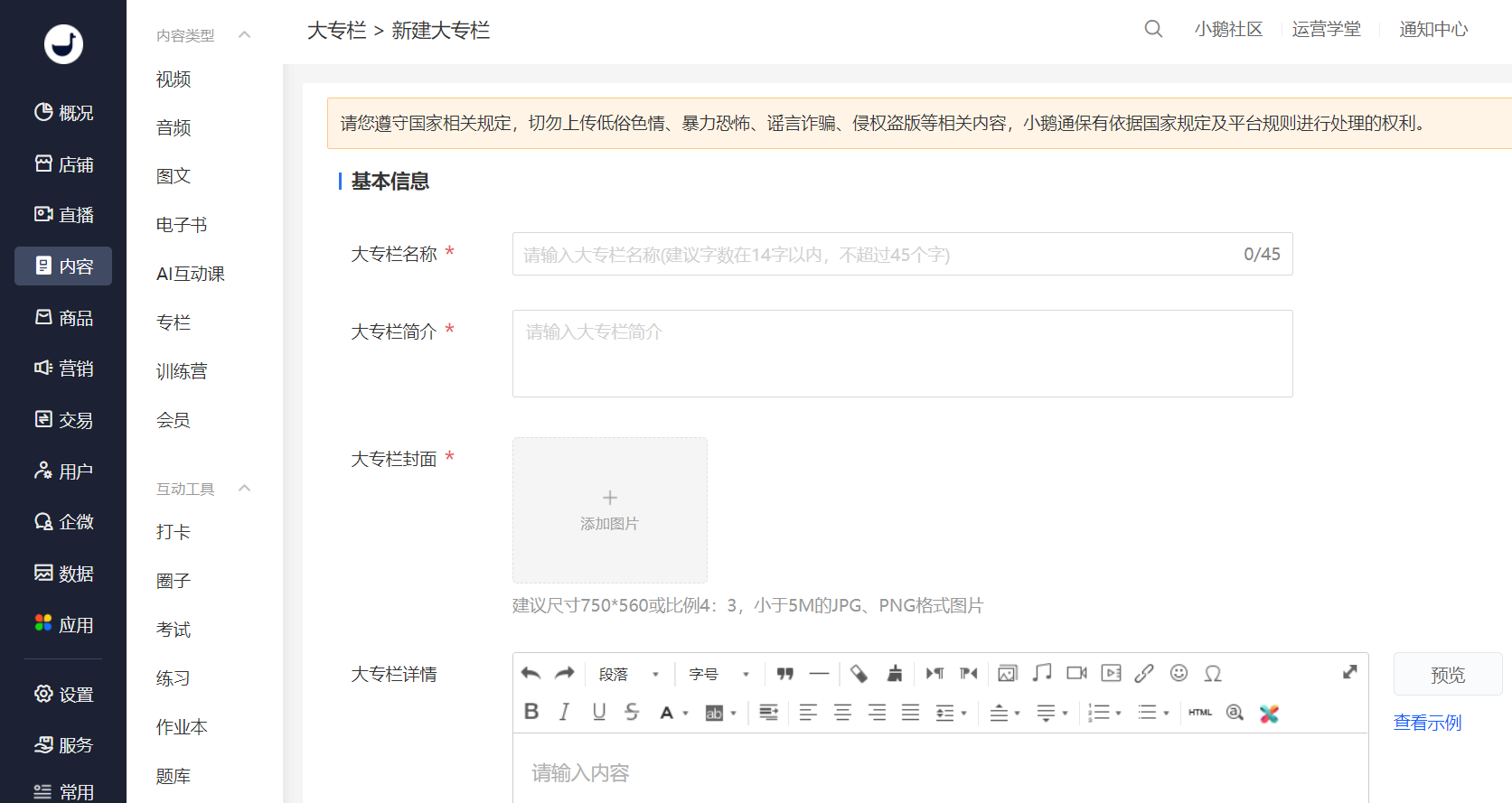 商家端:店铺管理后台 → 内容-内容类型 → 大专栏 → 新建大专栏