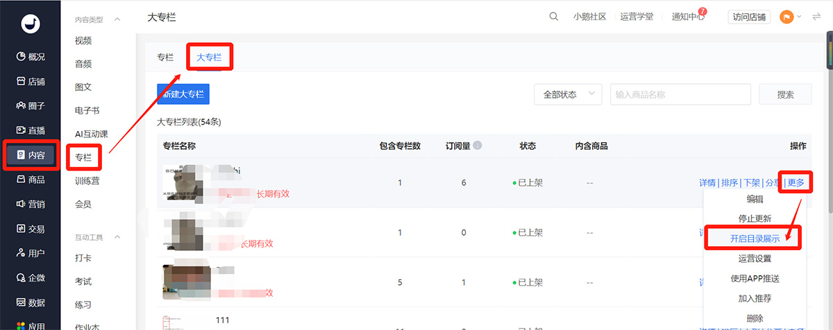 2、点击【更多】-【开启目录展示】-【确认】,即可让的用户在在购买前查看大专栏内商品目录。